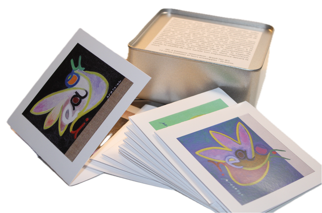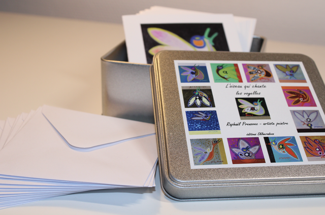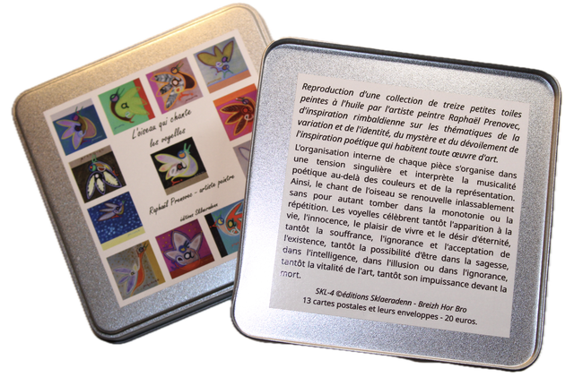 Coffret métallique de luxe comprenant 13 cartes postales ou cartes de voeux personnalisées sur le thème de "L'oiseau qui chante" correspondant à série d'oeuvres d'inspiration rimbaldienne réalisées par Raphaël PRENOVEC - artiste peintre.